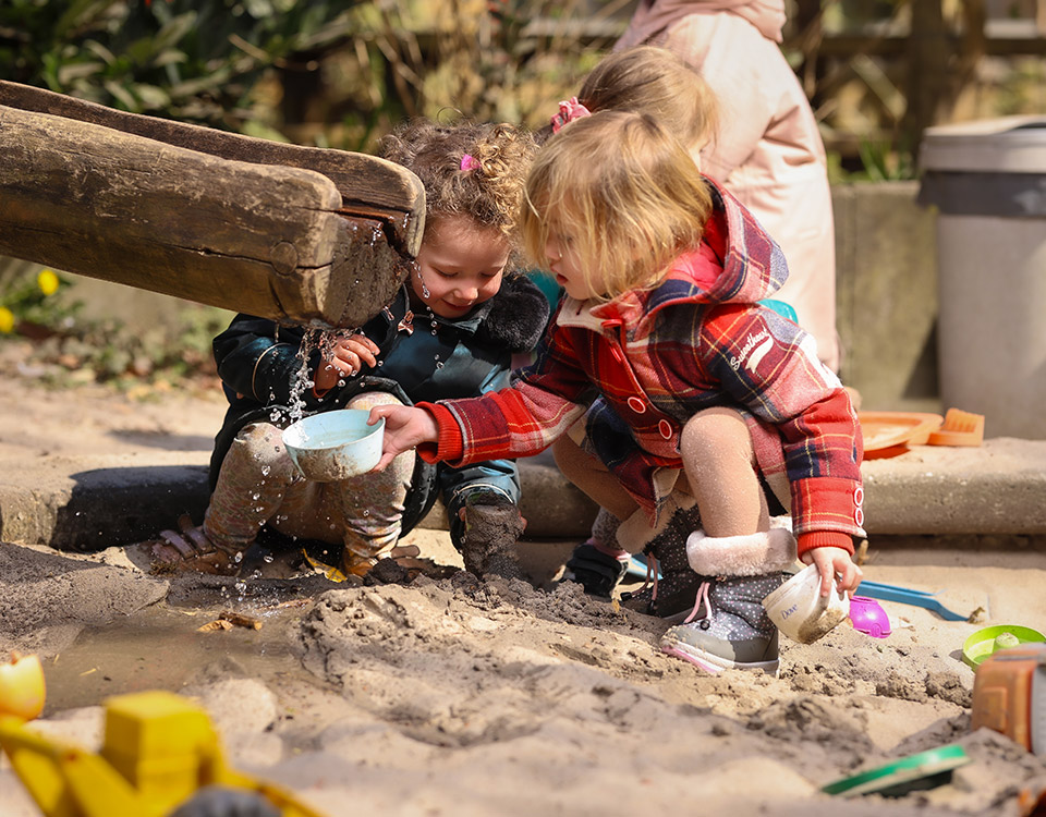 Als groen kinderdagverblijf zijn we veel buiten. Veel activiteiten lopen binnen en buiten in elkaar over; in de tuin kunnen kinderen in het vrije spel hun fantasie verder uitleven. Er is volop ruimte om lekker te rennen en te fietsen, er zijn hutten en een bospad. Ze kunnen met water, zand, takken, in de kruiptunnel of in de yurt van wilgentenen spelen.